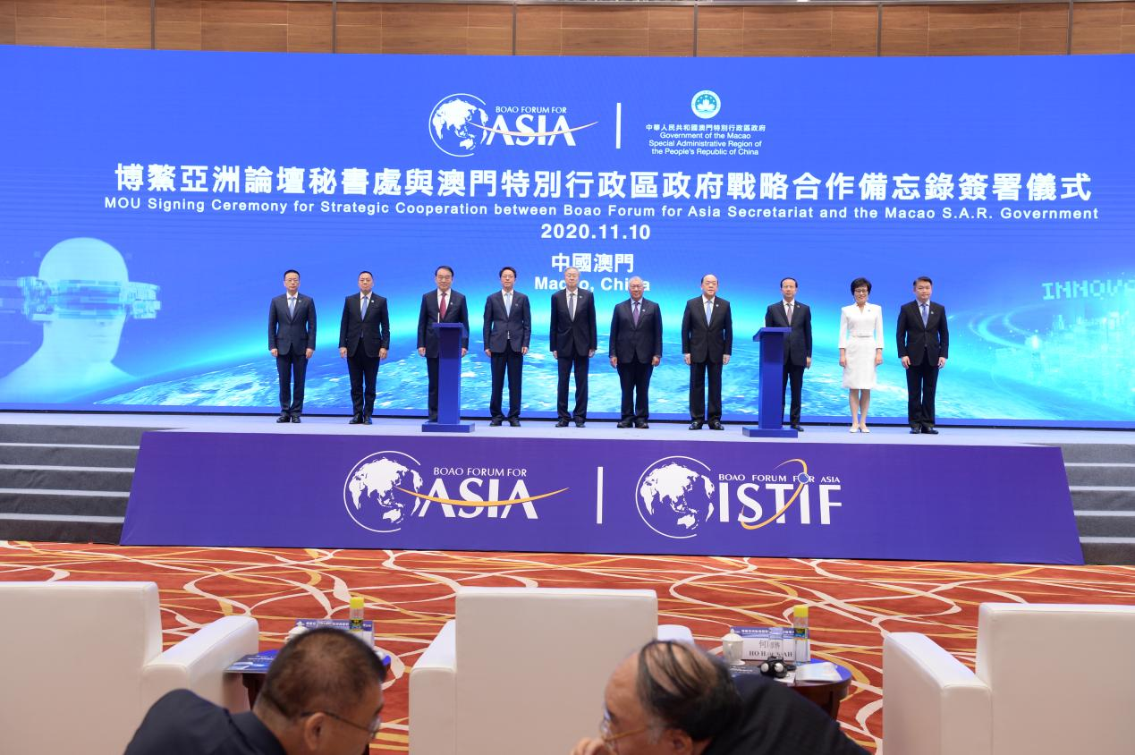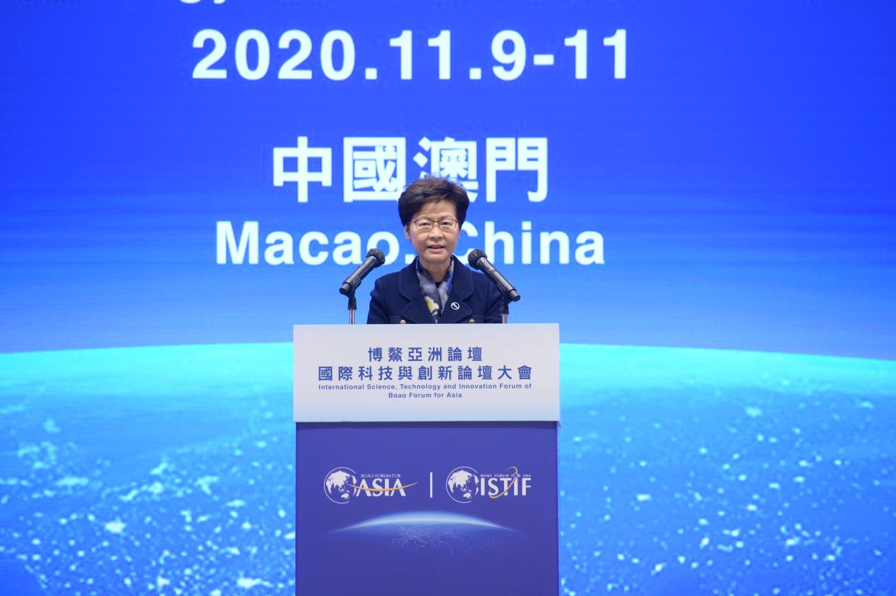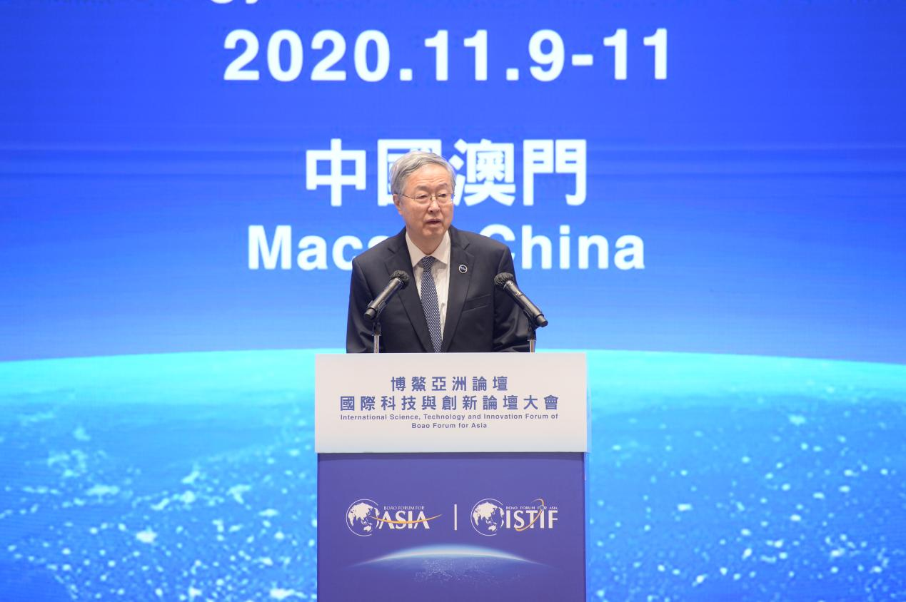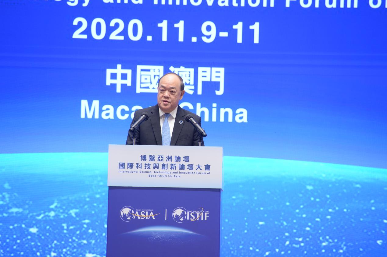 11月10日上午,博鰲亞洲論壇國(guó)際科技與創(chuàng)新論壇首屆大會(huì)在澳門-中國(guó)與葡語(yǔ)國(guó)際商貿(mào)合作服務(wù)平臺(tái)綜合體舉行開幕式。論壇東道國(guó)中國(guó)國(guó)家主席習(xí)近平發(fā)來(lái)賀信,國(guó)務(wù)院副總理韓正發(fā)表視頻主旨演講。論壇理事長(zhǎng)潘基文(視頻連線)、大會(huì)主席何厚鏵、論壇副理事長(zhǎng)及中方首席代表周小川、論壇理事菲律賓前總統(tǒng)阿羅約(視頻連線)、澳門特別行政區(qū)行政長(zhǎng)官賀一誠(chéng)、香港特別行政區(qū)行政長(zhǎng)官林鄭月娥分別發(fā)表致辭。論壇秘書長(zhǎng)李保東主持開幕式。阿爾及利亞駐華大使以及菲律賓、孟加拉、烏茲別克斯坦、巴基斯坦等論壇發(fā)起國(guó)駐華代表,以及來(lái)自18個(gè)國(guó)家和地區(qū)的近千名嘉賓,40多家媒體近百名記者參加大會(huì)開幕式。